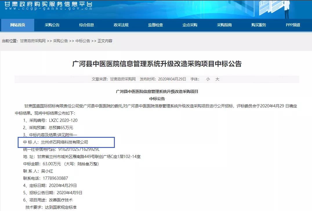 2020年4月29日,蘭州點(diǎn)石網(wǎng)絡(luò)科技有限公司在“廣河縣中醫(yī)醫(yī)院信息管理系統(tǒng)升級(jí)改造采購(gòu)項(xiàng)目”的競(jìng)標(biāo)中,憑借過(guò)硬的產(chǎn)品質(zhì)量、扎實(shí)高效的工作作風(fēng)、強(qiáng)大的技術(shù)實(shí)力以及良好的企業(yè)信譽(yù)以絕對(duì)的優(yōu)勢(shì)順利中標(biāo)。